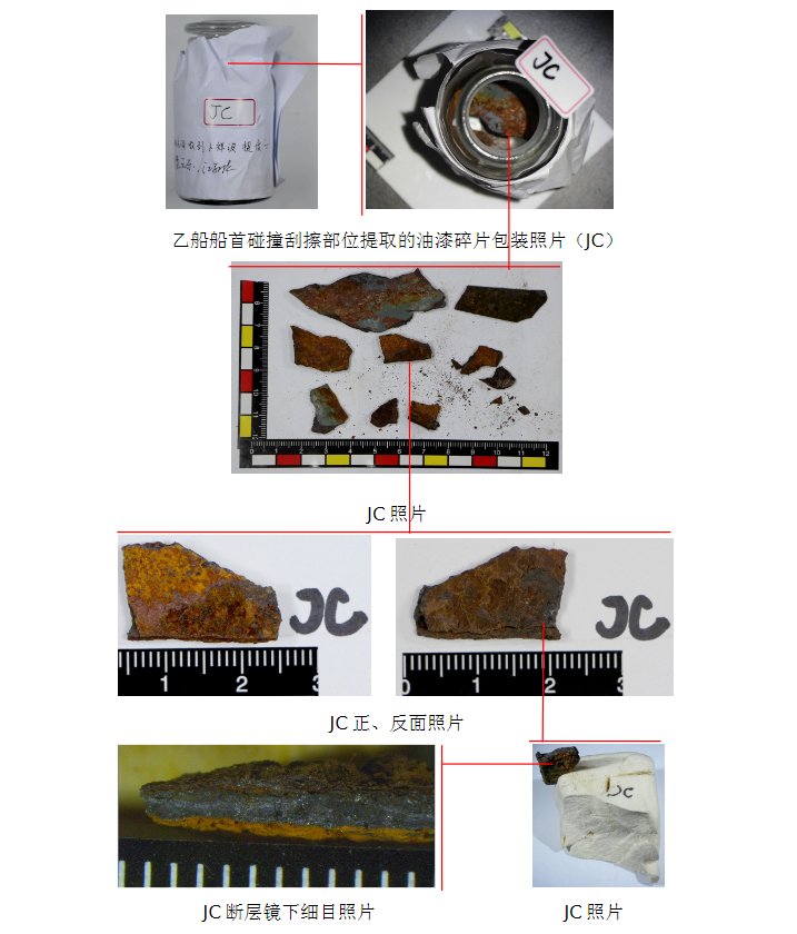 經(jīng)對送檢的JC與YB2-1、YB2-2鏡下斷層橫截面涂層比對檢驗確認,系同一物體在受外力作用下產(chǎn)生變形后,導致表面油漆涂層脆性斷裂脫落(甲乙兩船碰撞刮擦痕跡部位相互產(chǎn)生物質(zhì)交換)及粘附作用于承痕體、被承痕體表面。