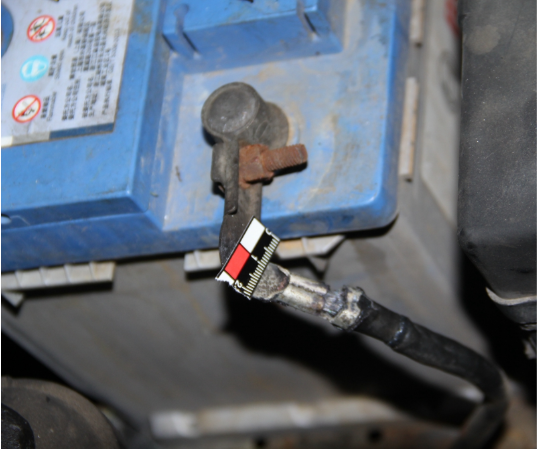 1、被鑒定車輛發(fā)動機艙左前部電瓶負*與電瓶線連接處可見高溫燒焦痕跡,并可聞到焦糊味。